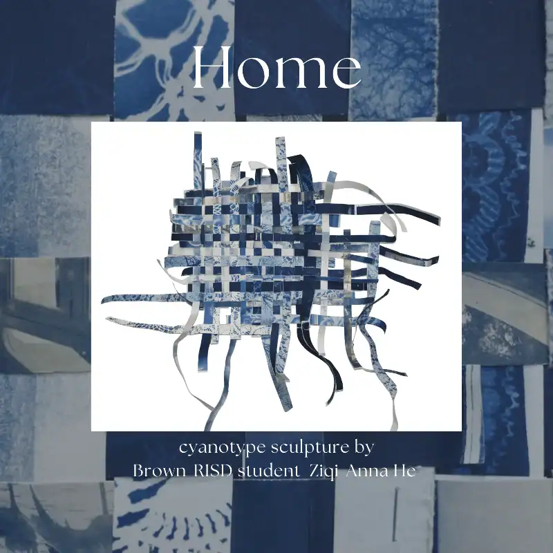 Home (2026) is a sculpture created by Brown-RISD dual degree student Ziqi-Anna He made from paper, cyanotype, and staples. It measures approximately 24″ x 24″ x 10″.