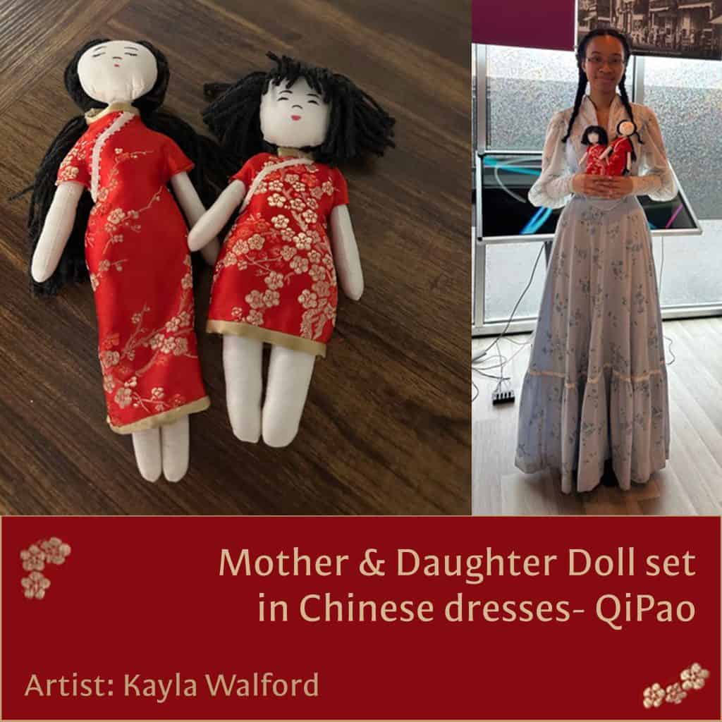 This beautifully crafted doll set tells a personal story of heritage and tradition. Inspired by Kayla’s own upbringing, the pieces reflect her mixed Chinese and Jamaican background and her cherished memories of celebrating Chinese New Year alongside her mother’s family. Each doll is thoughtfully designed and dressed in a traditional qi pao, honoring culture, identity, and the moments that shape who we are.