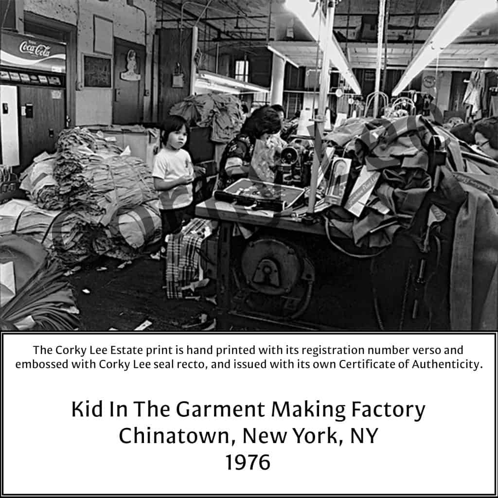 “Kid in the Garment Making Factory” is a 1976 photograph by Corky Lee, taken in Chinatown and printed in 2025 as an archival black-and-white digital C-print. This authorized estate print includes registration details, an embossed seal, and a certificate of authenticity. Lee, a pioneering photographer, spent over five decades documenting Asian American communities, creating a powerful visual record of everyday life and social history.