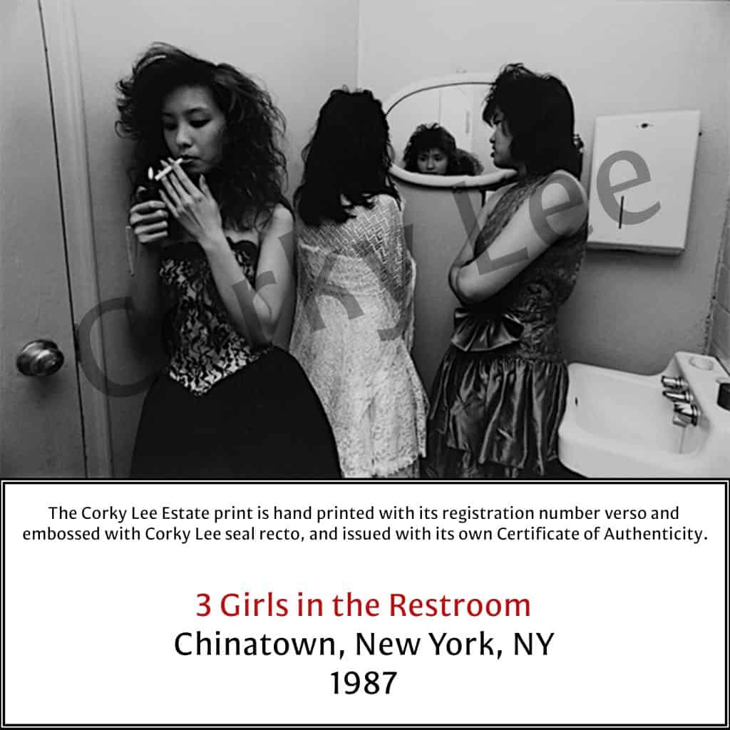 “3 Girls in the Restroom” is a 1987 photograph by Corky Lee, taken in Chinatown and printed in 2025 as an archival black-and-white digital C-print. This authorized estate print includes official registration details, an embossed seal, and a certificate of authenticity. Lee, a pioneering photographer, spent more than 50 years documenting Asian American life and history, earning recognition as both an artist and a vital visual historian.