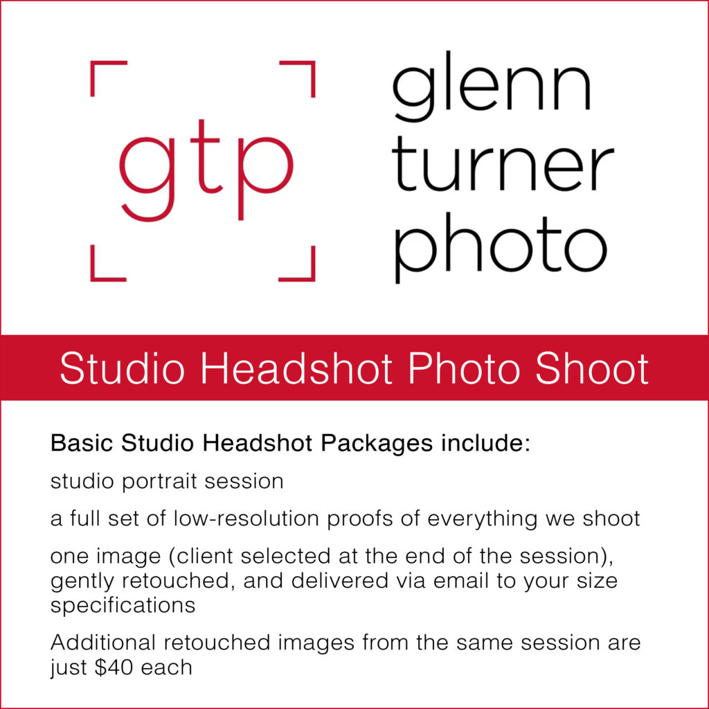 Basic Studio Headshot Packages include a studio portrait session, a full set of low-resolution proofs, and one client-selected image that is gently retouched and delivered via email to your specifications, with additional retouched images available for $40 each.